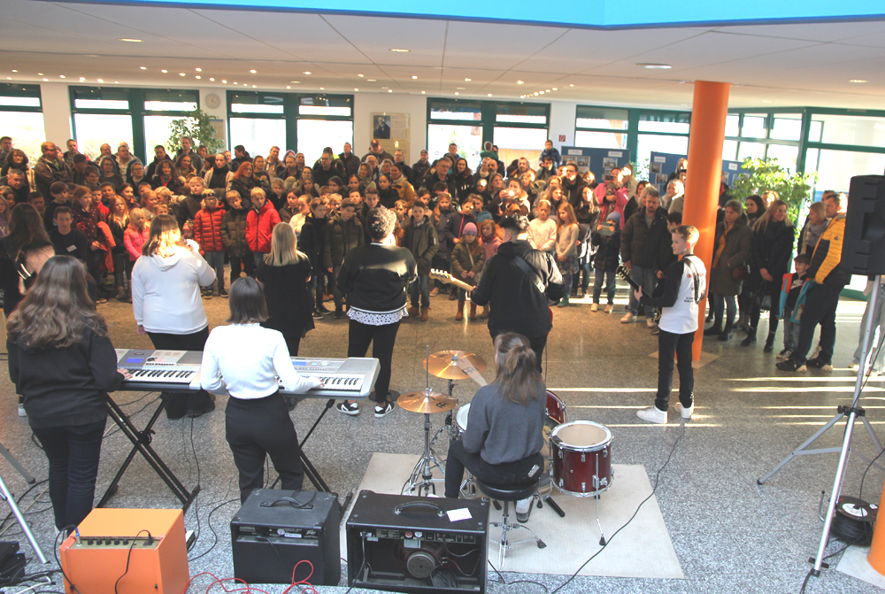 Am zweiten Schultag konnten 97 Kinder zusammen mit ihren Eltern für die vier 5. Klassen in der Aula von Schulleiterin Daniela Wolber begrüßt werden. Nach der musikalischen Eröffnung von Schülerinnen und Schüler der Klasse 7b und 7c unter Leitung von Lehrer Daniel Barth wurden die ersten Erwartungen geäußert: „Wir haben jetzt Englisch!“ und „…Geschichte ist auch neu… und dann kommt Technik!“